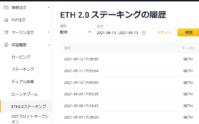 バイナンスでイーサリアム(ETH)をステーキング 報酬配布確認